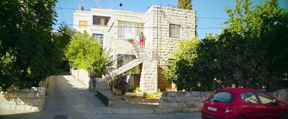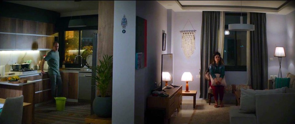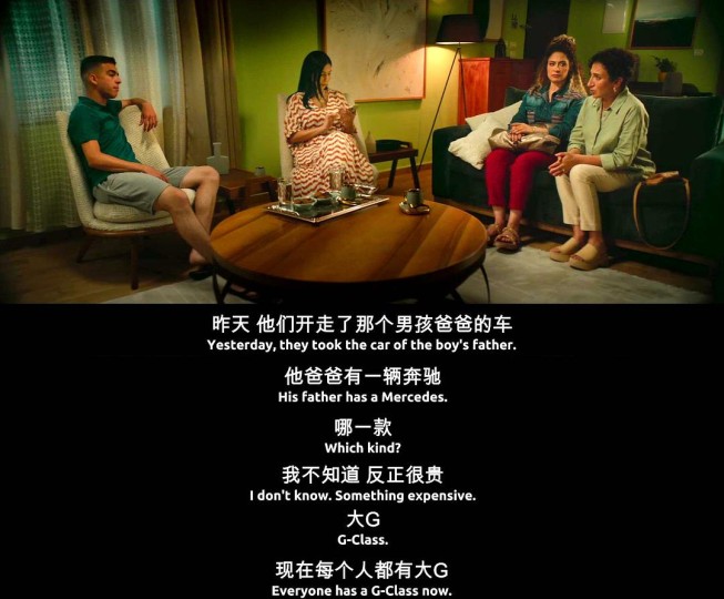 作为一部近些年来少有的全程在巴勒斯坦实景拍摄的影片,本片非常难得地向我们呈现出巴勒斯坦社会生活方方面面诸多真实的细节。由于巴解组织在处理和以色列关系的问题上采取了温和务实的态度,西岸地区的巴勒斯坦人得以生活在较为平和安定和富足的社会环境中。影片里一共出现了四个家庭的场景:姐姐家、父亲家、舅舅家、儿子的同学家。这些家庭呈现出的巴勒斯坦人的生活条件令人吃惊,比起国内北上广等一线城市的中产阶级家庭毫不逊色。当姐姐向儿子同学的母亲提到儿子开走另一个同学父亲的大奔时,同学的母亲竟然说“现在哪个家里没有大奔呢?”(见下面截图)。姐姐家位于一个整齐的居民社区,只是这里一个寻常单元里的普通一户,楼道整洁干净,就是这样的普通一户,家里有宽敞的客厅和厨房,至少三个卧室(两个男孩各一间), 滚筒洗衣机,对开门大冰箱,家里还有大型SUV。妹妹只是一个在美容院打工的单身女性,也有属于自己的一辆小轿车。她们的父亲则是住在独门独户的二层洋房里,老头子自己住二楼,把一楼出租给另一个老女人。