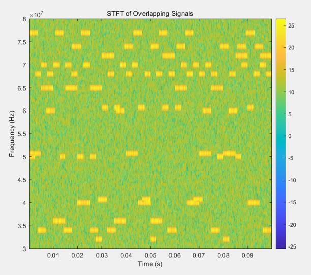 这个是在宿舍看的,当时也没绷住。因为时频图里颜色可以代表幅度,绘图时对幅度取了分贝值,就是想让信号和噪声的对比更突出一点,这里的colorbar刚好给映射成了黄和绿。