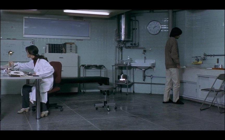 听见水果掉在地上的声音,教师打开了灯,昏暗的空间被照亮,间宫出现在后景,画面变成了景深镜头。