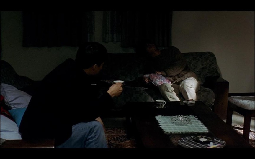 关上灯后,两人回到客厅,坐下对话。间宫的脚被茶几挡住,教师的脚被画框截断,两人处在怪异的景别中。