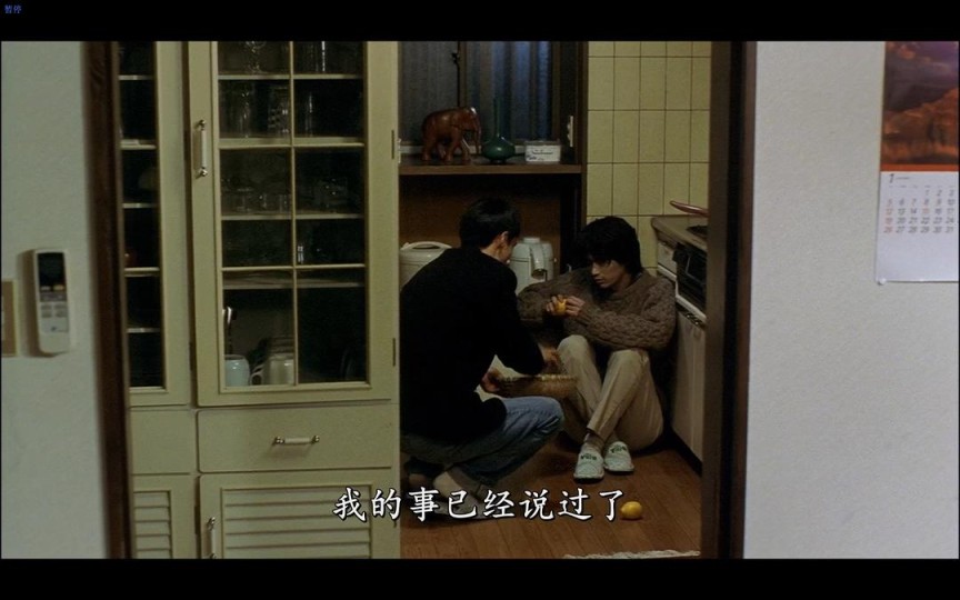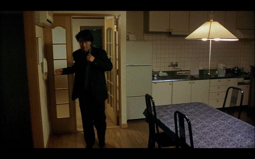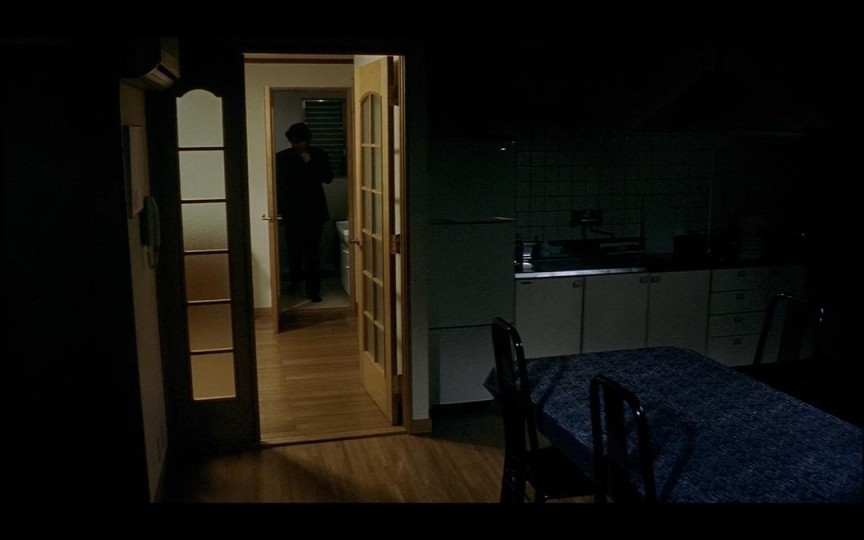 教师想要询问间宫的更多信息,向着间宫走去,摄影机随着教师横移。他走到厨房前,间宫正坐在黑暗的厨房里,只能勉强看清楚他的轮廓。