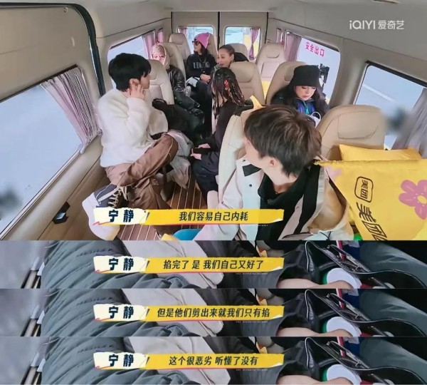 脾气急的何赛飞因为行程安排问题开麦,而宁静很巧妙地捕捉到了大家情绪的变化,用讲解“真人秀剪辑千层套路”的方式破冰,把矛盾转移到了真人秀恶剪,反而让气氛有点尴尬的几个人团结一心,说要保护自己。